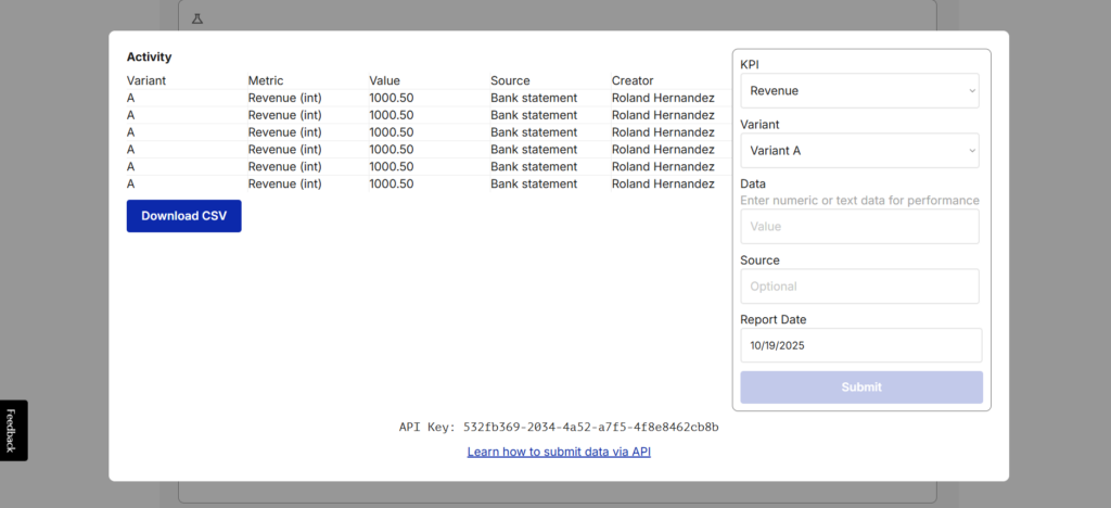 You can track how your experiment by opening the Metrics windows. You can submit data manually or programmatically (See developer docs).