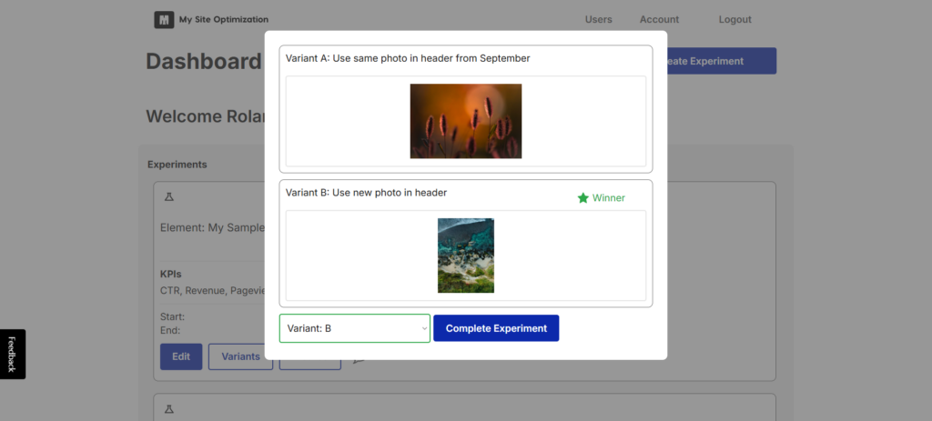Now that your experiment is setup, upload photos of both your variants so you can keep track of the changes visually. When there is a clear winner you can select a variant using the dropdown menu.
