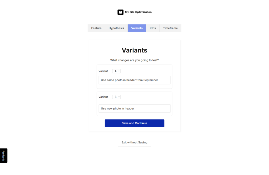 Variant will be how you keep track of the changes your making. Variant A should be what the feature is currently and Variant B should explain what you are changing in descriptive detail.