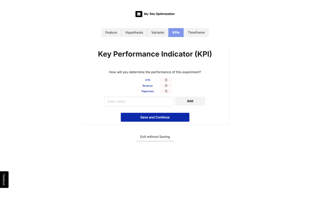 Key performance indicators (KPIs) are what help you decide whether the experiment is going as you expected. Some examples include: Click-Through Rate (CTR), Revenue, Pageviews, New Users, Signups, Email Subscriptions.